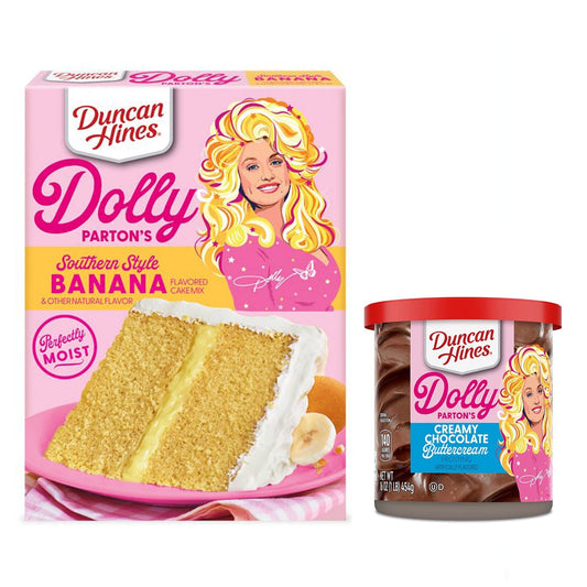 Duncan Hine's Dolly Parton's Favorite Southern-Style Banana Cake Mix with Spatula Gift Set! Banana Flavored Cake Mix With Chocolate Frosting.