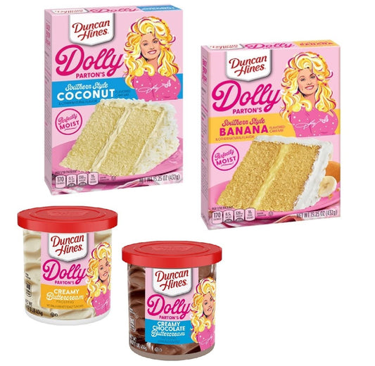 Duncan Hines Dolly Parton Cake 6 PACK, 3 boxes 15.25 oz of Dolly Parton Southern Style Banana cake mix, 3 boxes 15.25 oz of Dolly Parton Southern Style Coconut cake mix, 3 containers 16 oz each of Dolly Partons Creamy Chocolate Buttercream Icing, 3...