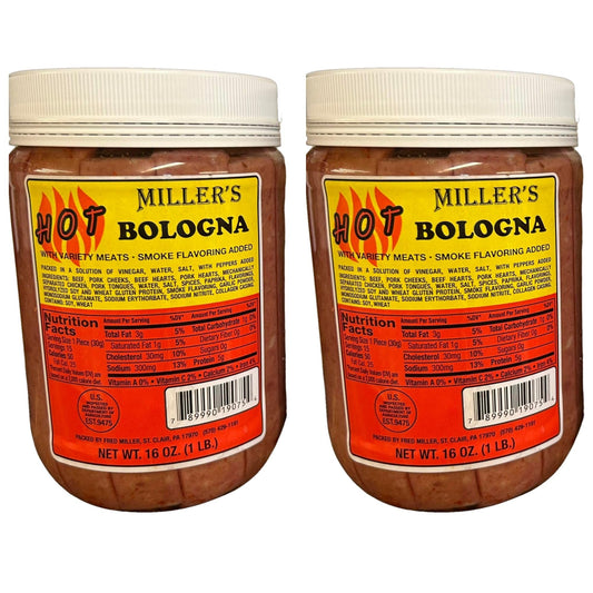 Miller’s Hot Bologna – 2-Pack Bundle by Putt Pantry – Zesty Pickled Bologna Sausage in a Hot Pepper Vinegar Brine – Amish-Style Snack, Ready to Eat, 16 oz Each