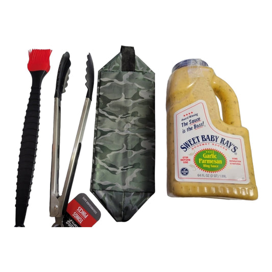 Mens Father's Day Grill Bundle, includes Mens travel bag, 1 jug 64oz of Sweet Baby Rays Sauce, Grill Tongs and basting Brush. Gifts for him, Valentines Gift for him