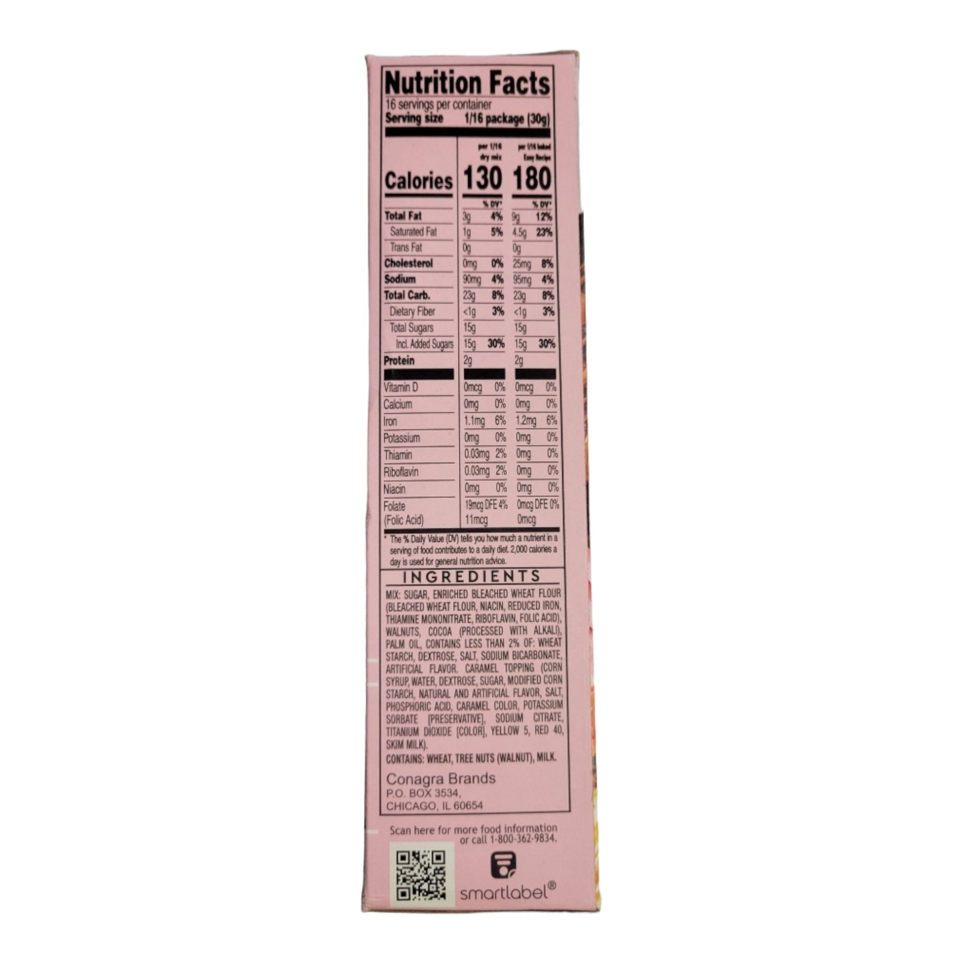 The Carmel Turtle Brownie mix includes Carmel Drizzle and Walnuts for the perfect topping.