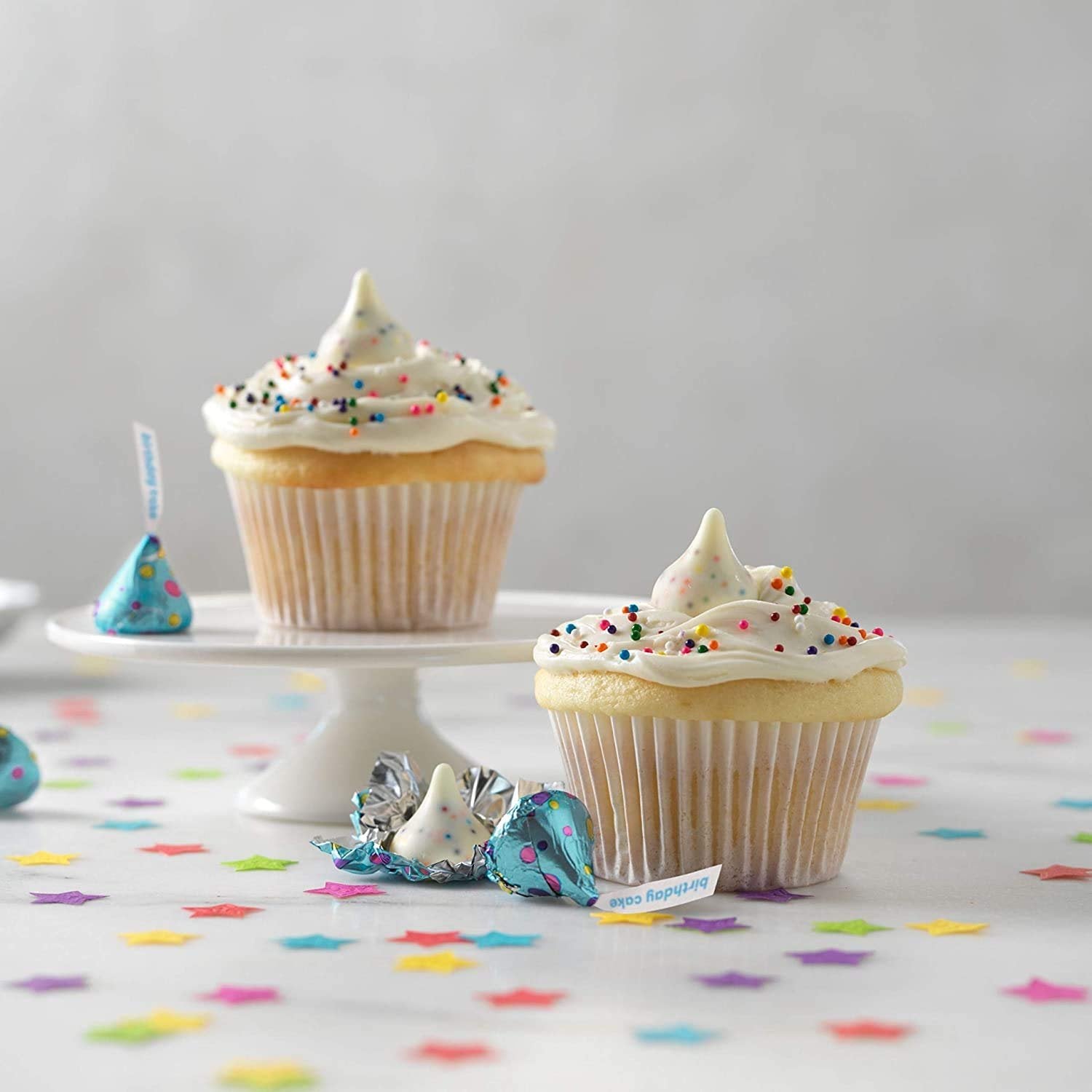Includes two (2) 10 oz bag of HERSHEY'S KISSES Birthday Cake flavored White Crème Candy share size stand up bagsDeliciously sweet white cream flavored like birthday cake with colorful sprinkles in the kiss!