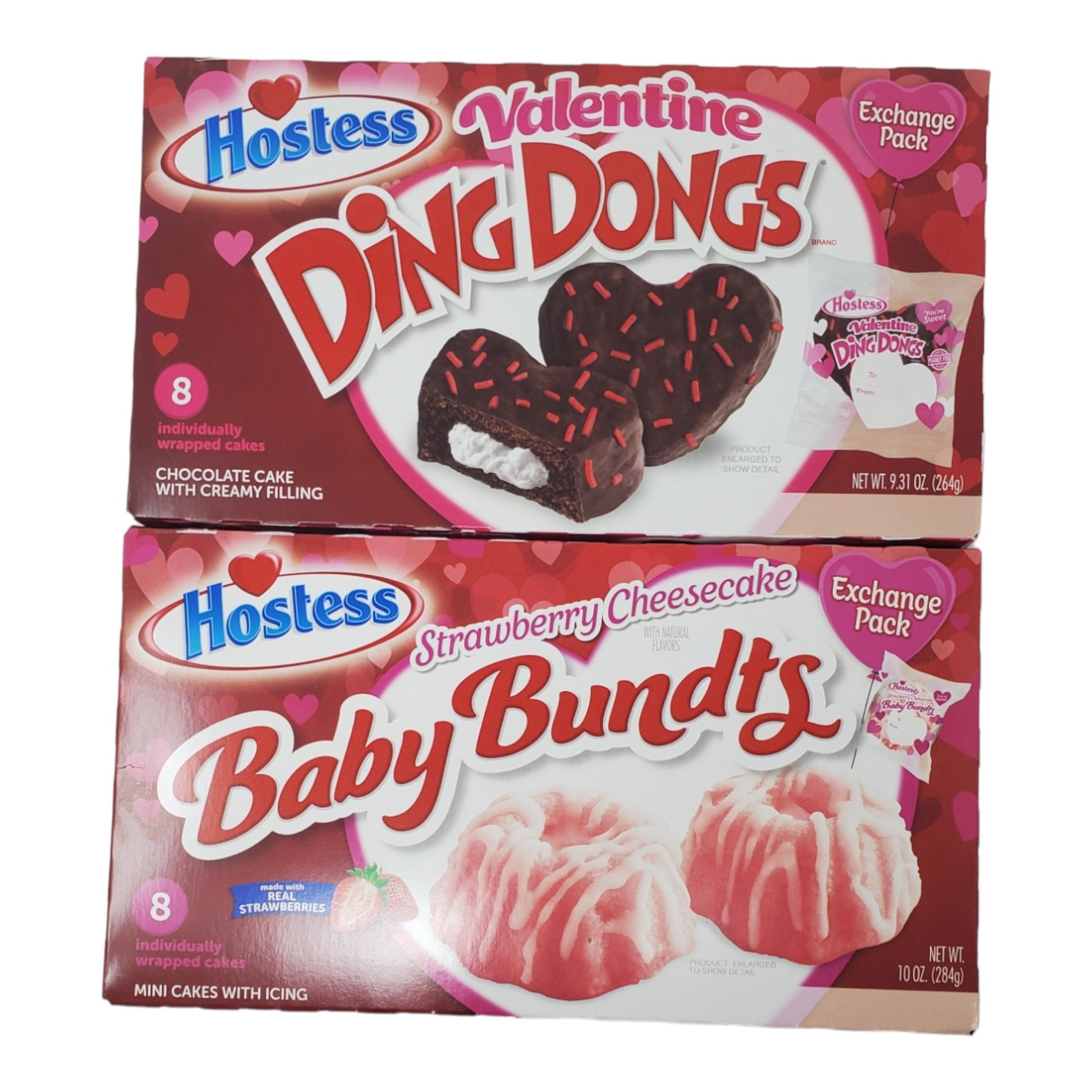 Valentine's Day Cupid Bundle includes16 Exchange Pack Cakes (8 of each variety)1 box - Hostess Valentine Ding Dongs, 9.31 oz, contains 8 individually wrapped chocolate cakes with creamy filling1 box - Hostess Strawberry Cheesecake Baby Bundts, 10 oz, containes 8 individually wrapped mini cakes with icing, made with real strawberries