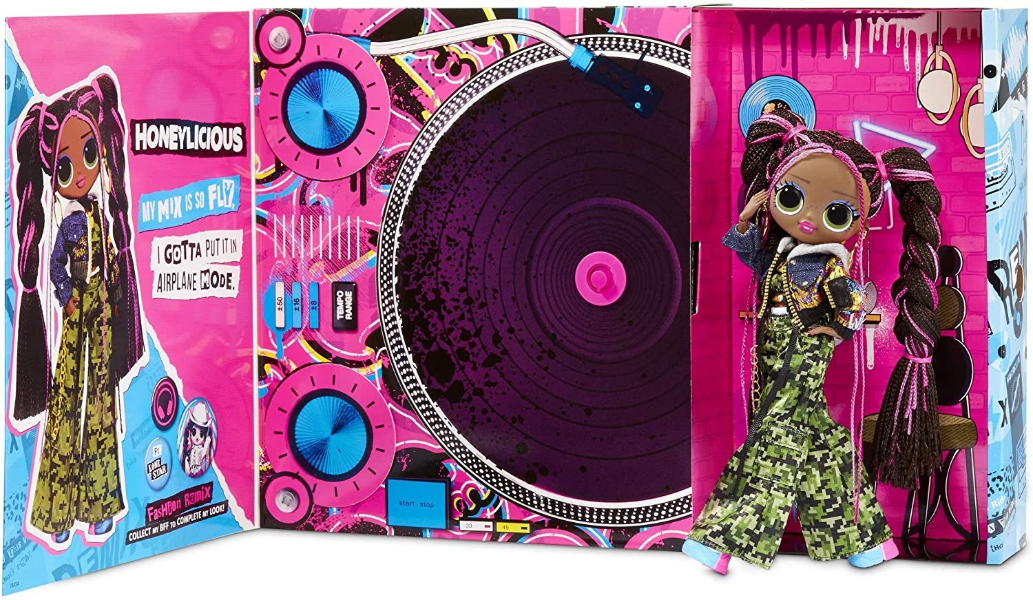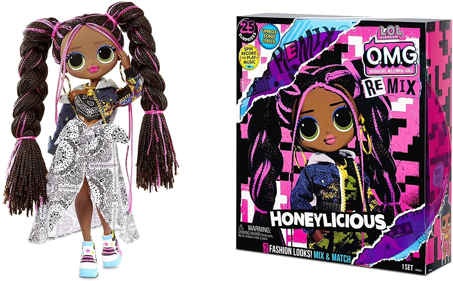 - LET'S RE-MIX HONEYLICIOUS : shimmering coat and holographic fashion, she's taking the spotlight and performs to the stage confidently. She comes with 2 outfits. Mix and match fashions with her BFF, LOL Surprise OMG Pop B.B. doll, share clothes for a fun way of expressing self-fashion.