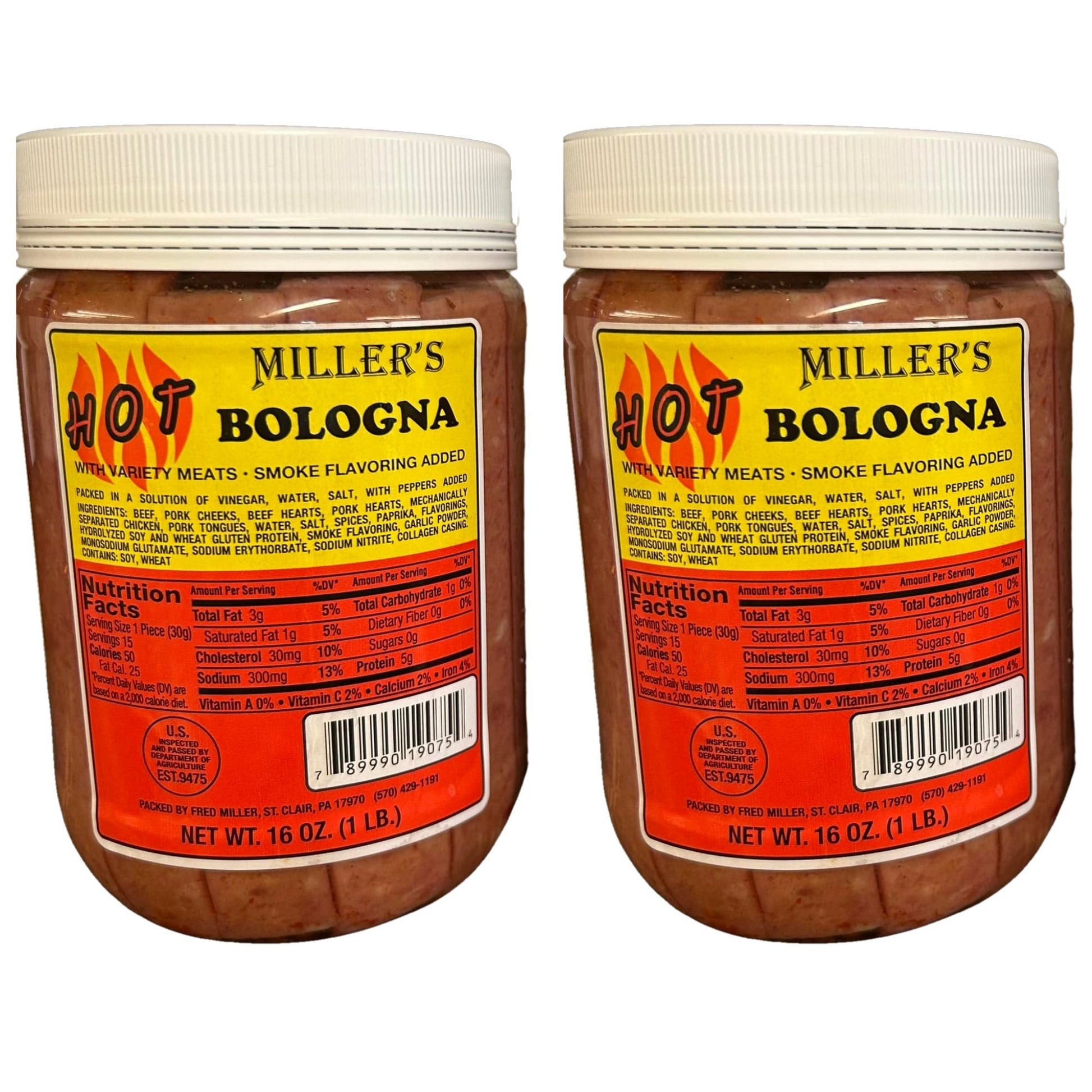 Bold & Zesty Flavor: Enjoy the spicy kick of Miller’s Hot Bologna, pickled to perfection in a savory vinegar brine for a tangy, satisfying bite. Amish-Style Quality: Made in small batches using premium beef and pork, this classic treat delivers old-fashioned flavor you can taste. Convenient 2-Pack: Get two 16 oz jars – ideal for sharing, gifting, or keeping one at home and one at the office. Ingredients Beef, Pork Cheeks, Beef Hearts, Pork Hearts, Mechanically Separated Chicken, Pork Tongues, Water, Salt, Spices, Paprika, Flavorings Hydrolyzed Soy And Wheat Gluten Protein, Smoke Flavoring, Garlic Powder, Monosodium Glutamate, Sodium Erythorbate, Sodium Nitrite, Collagen Casing.