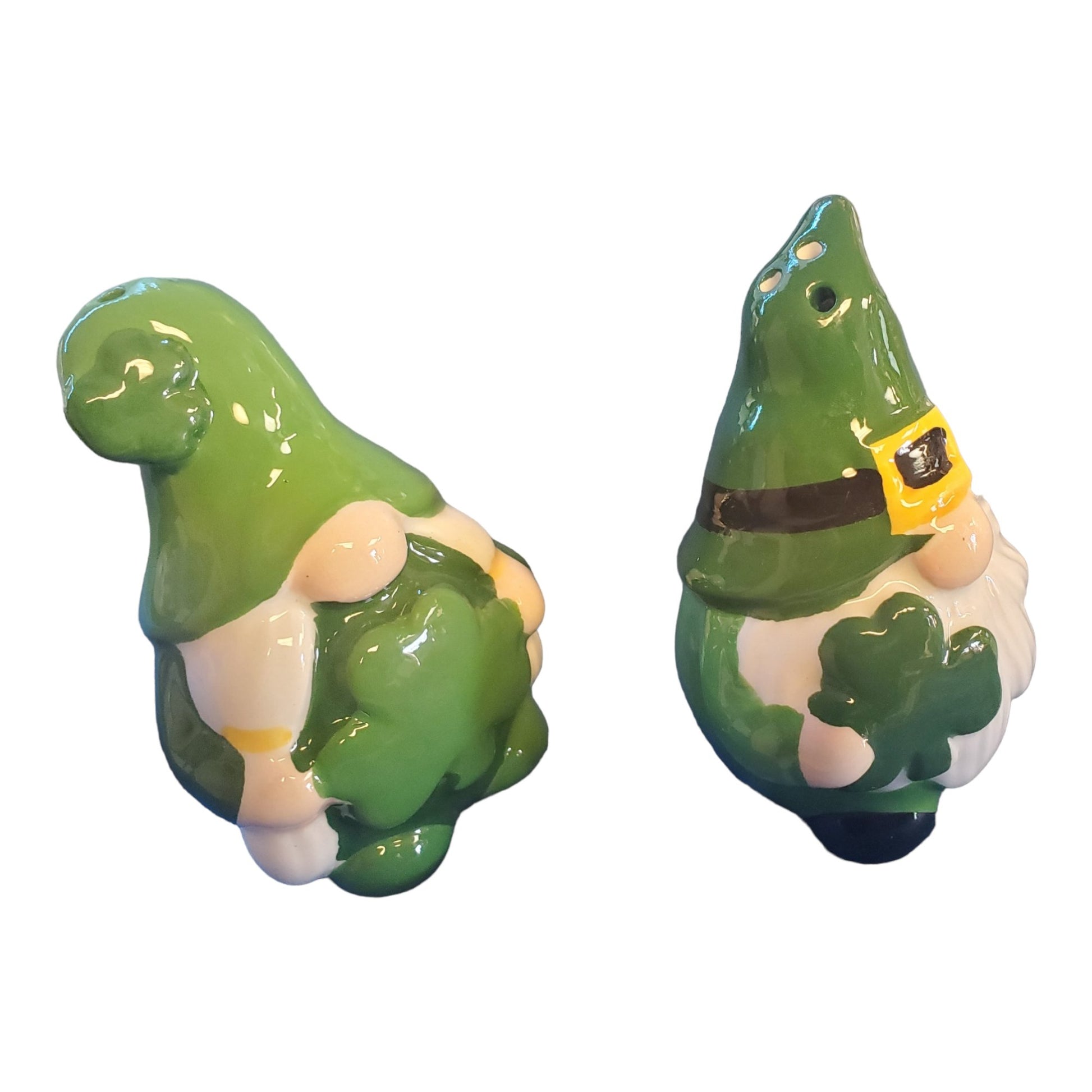 Putt Pantry St. Patricks Day Gnome Decor Bundle, 2 Decorative St Patty Kitchen Towels, Set of Gnome Salt and Pepper Shakers, 1 lb of Milk Chocolate Mint Truffles, packaged by Putt Pantry in a Wire Basket.