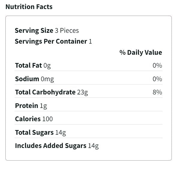 Glucose Syrup, Sugar, Gelatin, Sorbitol, Modified Corn Starch, Citric Acid, Agar, Malic Acid, Artificial Flavors, Glazing Agent, Palm Oil, Carnauba Wax, Sodium Citrate, Artificial Colors, Titanium Dioxide, Yellow 5, Yellow 6, Red 40, Blue 1